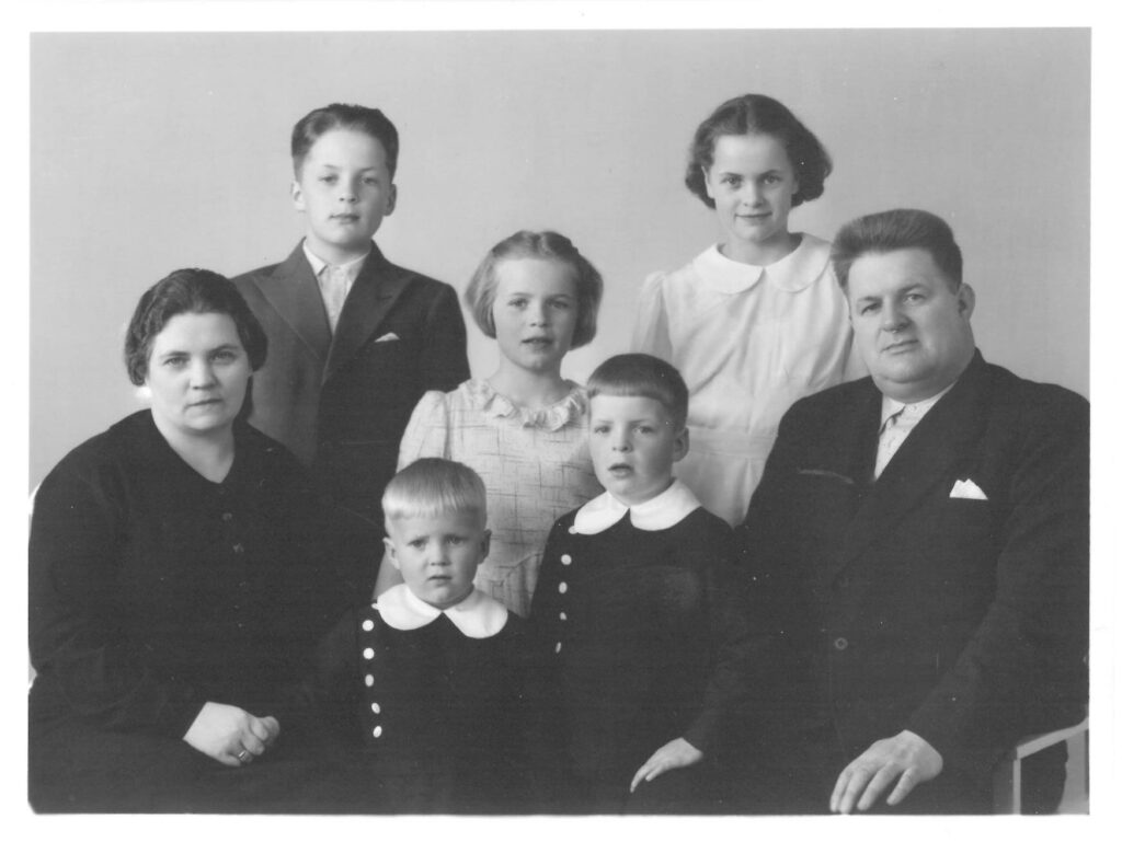 Familiebilde fra 1937-38. Bak fra venstre: Kåre, Oline, Mathilde, Gunvor, Ole, Siksten og Ole-Martin.